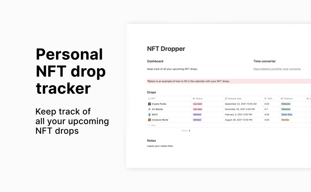 NFT drop trackerA$2A$2https://schema.org/InStockaudGrant Stewart0 ratingsKeep track with all your favourite upcoming NFT drops with this Notion template.QuantityI want this!Add to wishlist New wishlist